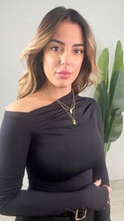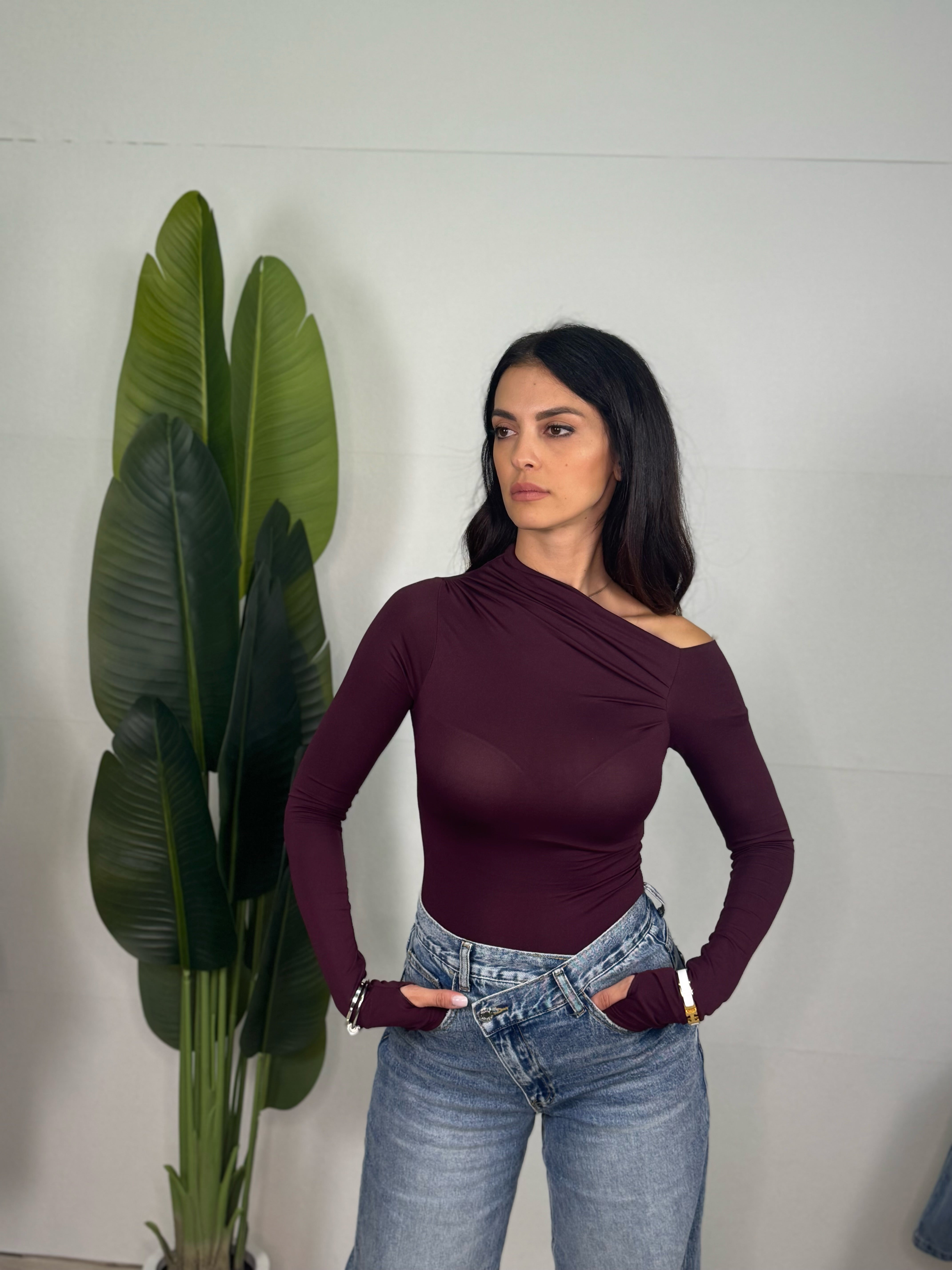 Maglia elasticizzata con dettaglio sulla spalla disponibile in tre colorazioni