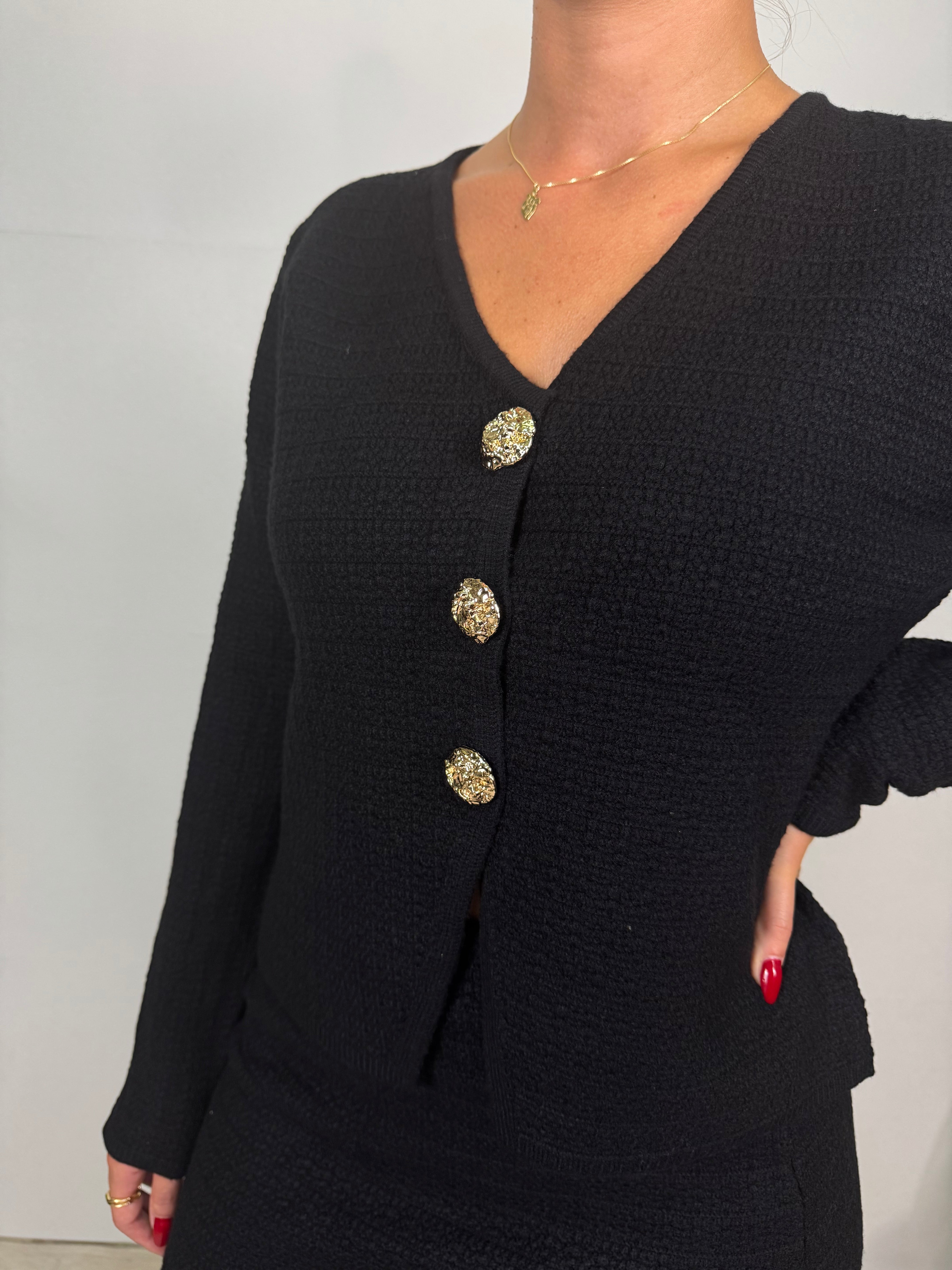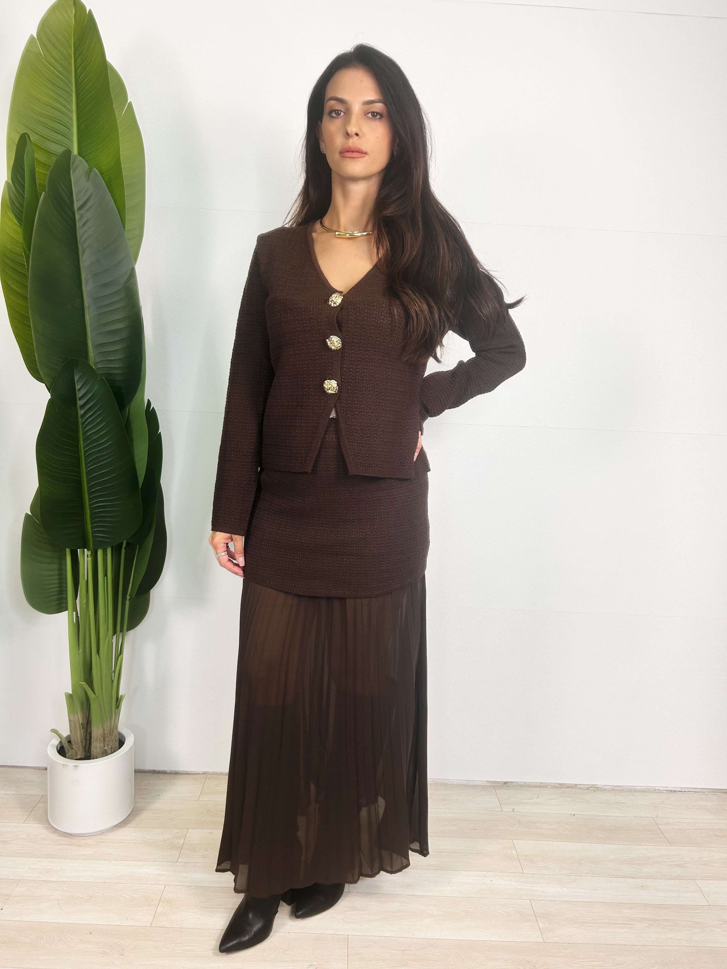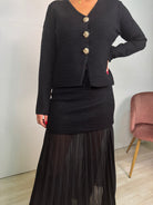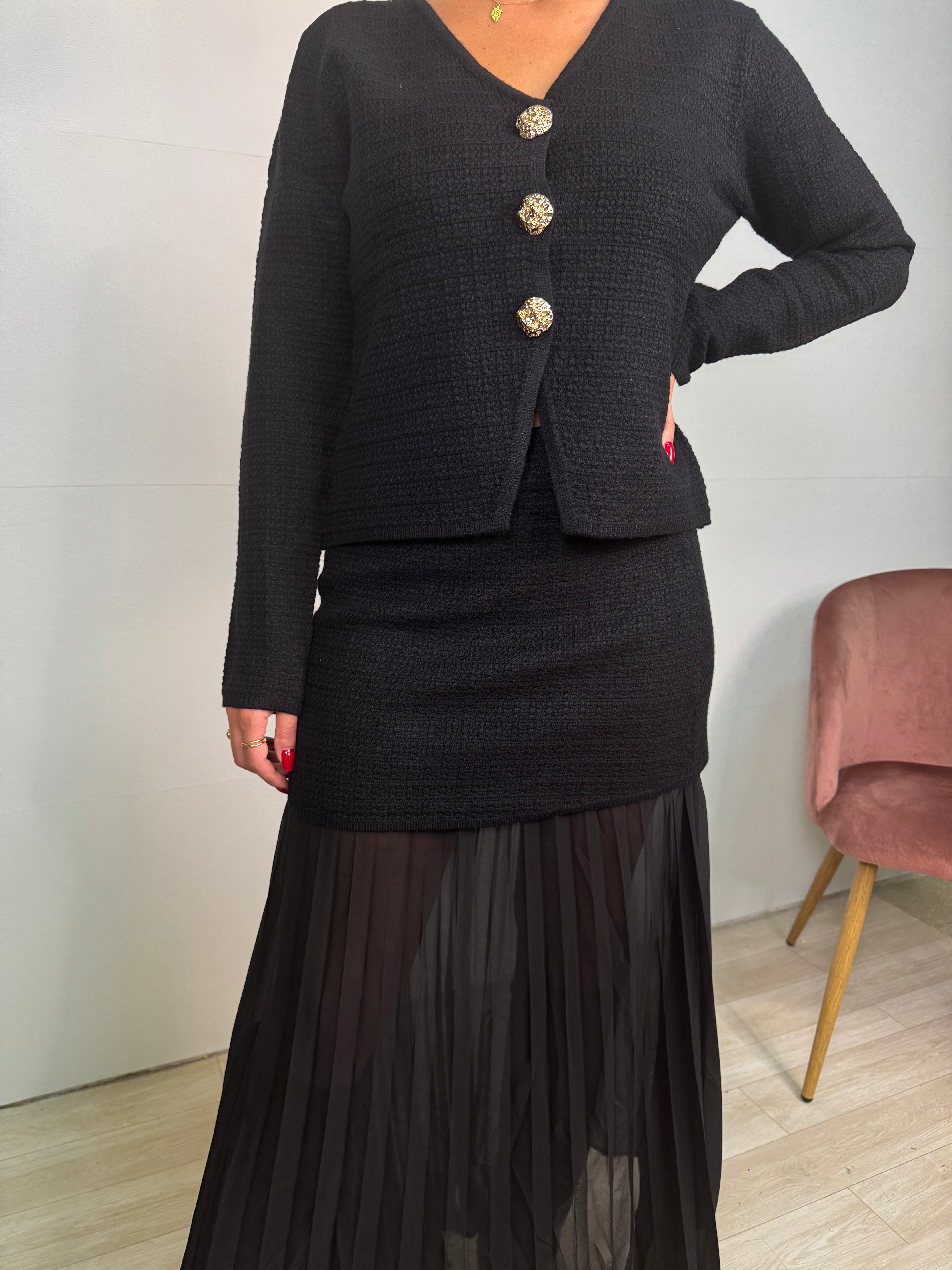 Completo taglia unica con cardigan con bottoni oro e gonna con velo, elasticizzato disponibile in nero e marrone